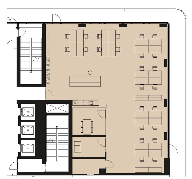 Lejemålet består af ét stort åbent lokale samt 3 mindre mødelokaler/stillerum/kontorer. Lejemålet rummer mange muligheder for spændende indretning.