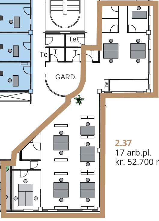 Dette kontorlejemål er ideelt for større teams eller virksomheder, der ønsker at samle afdelinger under samme tag. Lejemålet rummer: