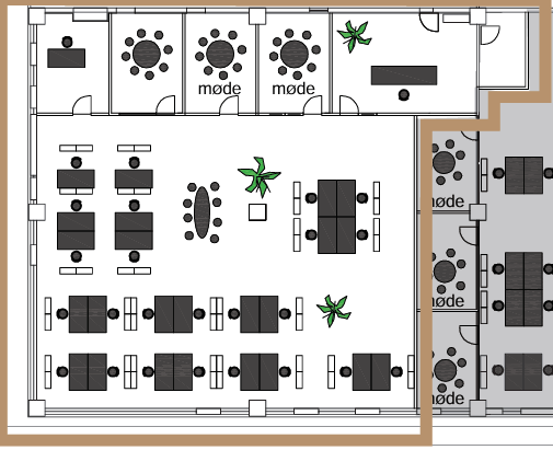 Lejemålet består af ét stort åbent lokale samt 6 mindre mødelokaler/stillerum/kontorer/printerrum. Lejemålet rummer mange muligheder for spændende indretning.
