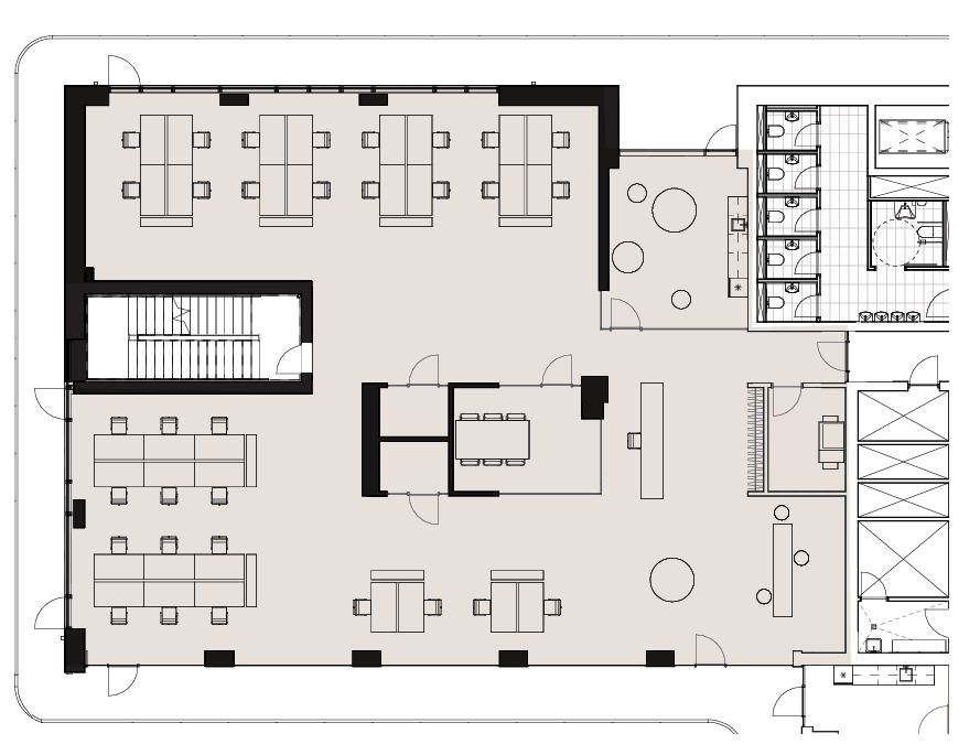 Lejemålet består af et stort, lyst og åbent kontorområde, som giver optimale muligheder for effektiv arbejdspladsindretning og teamzoner. Hertil kommer seks mindre rum, perfekte som mødelokaler, stillerum eller private kontorer. Lejemålet har desuden eget køkken, mens fælles toiletter findes på gangen.