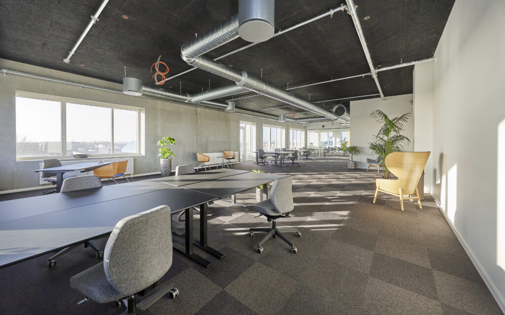 Højhuset byder på højt til loftet, rå betonvægge, gulv-til-loft-vinduer og fantastisk udsigt. Lejemålene varierer fra 346–1.344 m² pr. etage og giver mulighed for at sætte eget præg på indretningen.