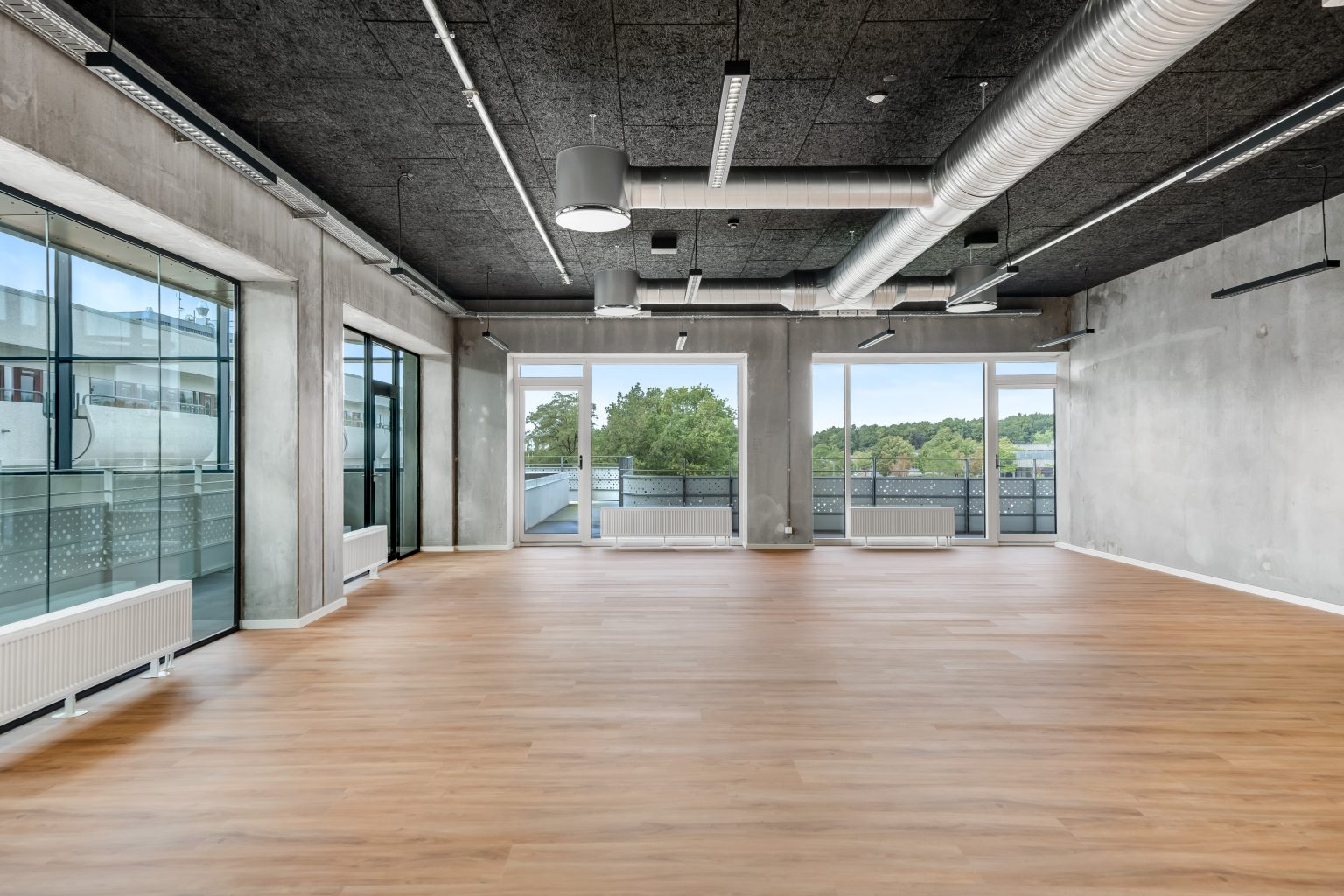 Højhuset byder på højt til loftet, rå betonvægge, gulv-til-loft-vinduer og fantastisk udsigt. Lejemålene varierer fra 346–1.344 m² pr. etage og giver mulighed for at sætte eget præg på indretningen.