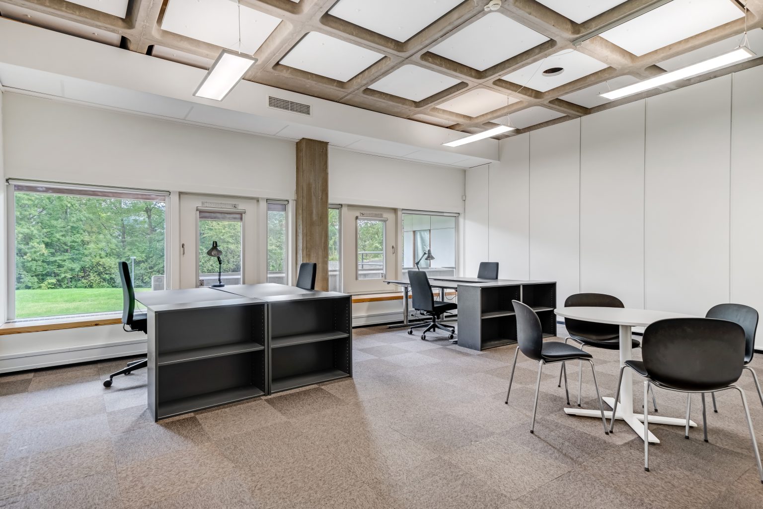 Delt kontor: Fly-in plads kr. 1.800, fast arbejdsplads kr. 3.100 pr. måned all inclusive.